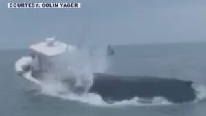 A breaching whale crashed into a boat off the coast of New Hampshire, capsizing the vessel and sending two mariners...