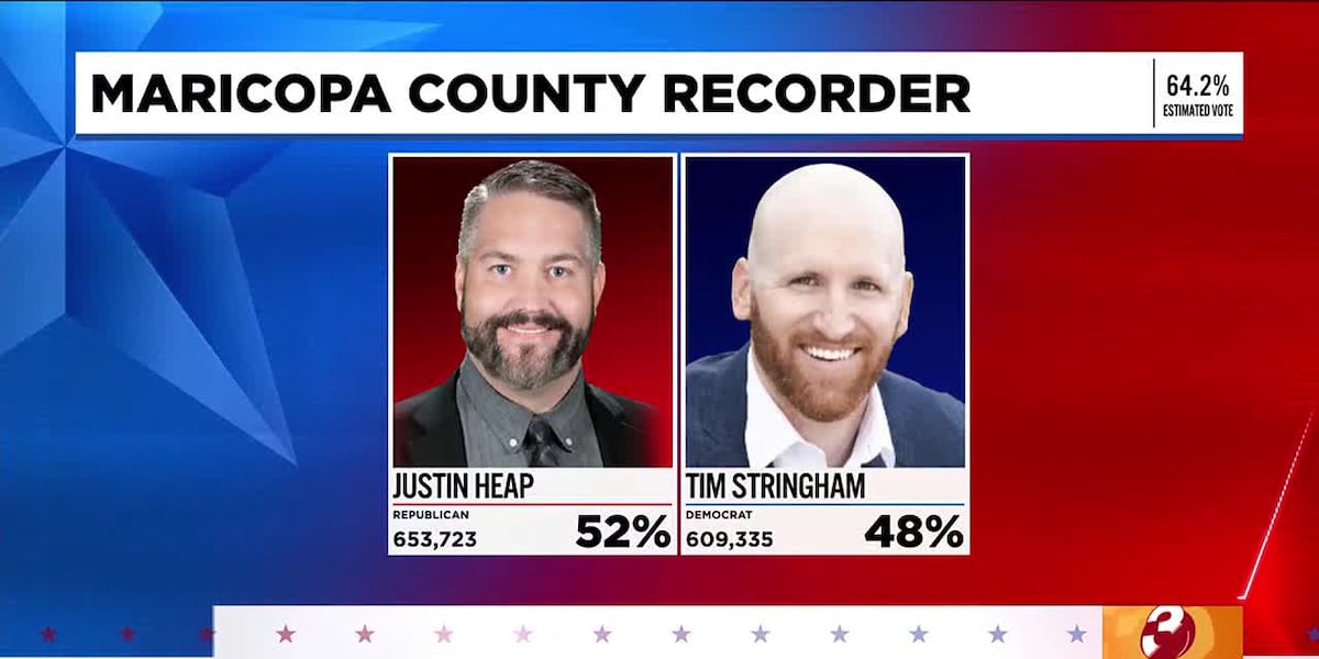 Early election returns show the Maricopa County recorder’s race remains razor-tight as of early Wednesday morning. Republican Justin Heap has a narrow lead compared to Democrat Tim Stringham.