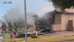 Two Valley fire departments respond to a garage fire in Phoenix on Saturday that damaged two vehicles.