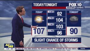 A slight chance of storms in the Valley with a high near 107°F.