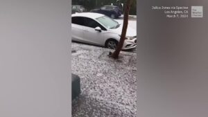 A thunderstorm that moved across the Los Angeles area dumped hail over parts of the city. Locally heavy rain and...
